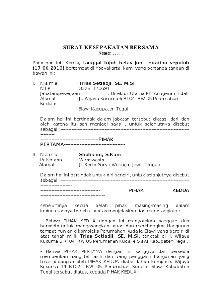 Conoth Surat Perjanjia Tanah Bersama / Doc Surat Pernyataan Bersama Aji Irawan Academia Edu - Segala sengketa yang nanti timbul dari surat perjanjian jual beli tanah ini telah disepakati oleh para.. Contoh surat perjanjian hutang piutang. Home » contoh surat » surat perjanjian » contoh surat perjanjian jual beli tanah. Contoh surat perjanjian jual beli sangat beragam karena ada banyak jenisnya seperti surat perjanjian jual beli rumah, surat perjanjian jual beli motor, surat perjanjian jual beli tanah, dll. Surat perjanjian jual beli tanah. Perjanjian secara lisan jaman sekarang banyak orang yang tidak mau menjalani, mereka harus menggunakan surat pernyataan yang jelas.